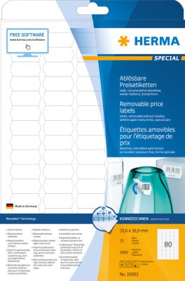 Herma No. 10002 fehér színű 35,6 x 16,9 mm méretű, univerzálisan nyomtatható, öntapadós árazó címke, visszaszedhető ragasztóval A4-es íven - kiszerelés: 2000 címke / 25 ív