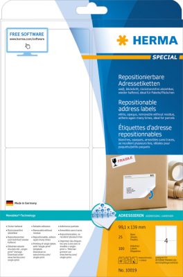 Herma No. 10019 fehér színű 99,1 x 139 mm méretű, univerzálisan nyomtatható, öntapadós etikett címke, visszaszedhető ragasztóval A4-es íven - kiszerelés: 100 címke / 25 ív