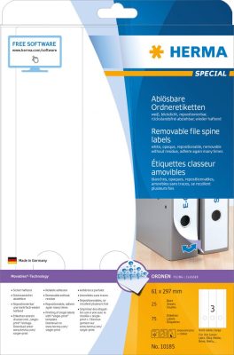 • Herma No. 10185 univerzális 61 x 297 mm méretű, visszaszedhető fehér öntapadó iratrendező címke A4-es íven - 75 iratrendező címke / csomag - 25 ív / csomag (Herma 10185)