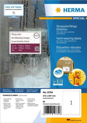 • Herma No. 10784 fehér színű 210 x 297 mm méretű, lézernyomtatóval nyomtatható, öntapadós időjárásálló etikett címke, extra erős, tartós ragasztóval A4-es íven - kiszerelés: 80 címke / 80 ív