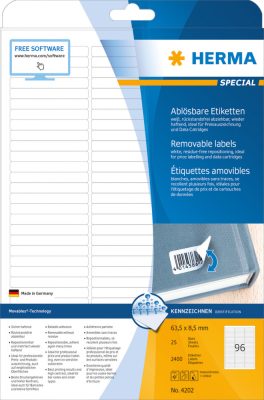 Herma No. 4202 fehér színű 63,5 x 8,5 mm méretű, univerzálisan nyomtatható, öntapadós etikett címke, visszaszedhető ragasztóval A4-es íven - kiszerelés: 2400 címke / 25 ív