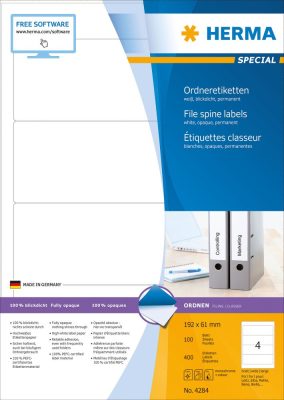 Herma fehér színű nyomtatható, nagy fedőképességű, öntapadó iratrendező címke A4-es lapon, 192 x 61 mm-es méretben, kerekített sarkokkal, normál ragasztóval. (Herma 4284)
