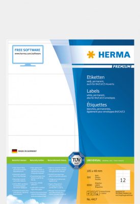 Herma No. 4417 fehér színű 105 x 48 mm méretű, univerzálisan nyomtatható, öntapadós etikett címke, permanens ragasztóval A4-es íven - kiszerelés: 6000 címke / 500 ív