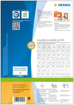 Herma prémium nyomtatható öntapadós címkék általános felhasználásra és címzésekre. Magas minőség, kiváló nyomtatási kép, erős és megbízható tapadás jellemzi. A Herma prémium nyomtatható öntapadós etikett címkéi megfelelnek a legszigorúbb minőségi és technológiai elvárásoknak is. A Herma prémium címke és a csomagolás 100%-ban újrahasznosítható alapanyagokból készül.