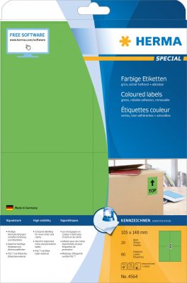 Herma No. 4564 zöld színű 105 x 148 mm méretű, univerzálisan nyomtatható, matt felületű öntapadós etikett címke, visszaszedhető ragasztóval A4-es íven - kiszerelés: 80 címke / 20 ív