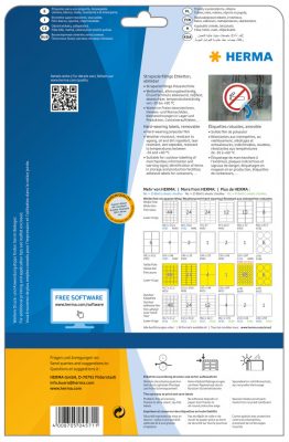 A Herma nyomtatható öntapadós címkéi kompatibilisek az általánosan forgalomban lévő irodai nyomtatókkal. A címkeív teljesen sík felületű, valamint négy papírmentes lapszéllel rendelkezik, mely ragasztómentes terület biztosítja, hogy nyomtatás közben ne kerülhessen ragasztómaradvány és egyéb szennyező anyag a nyomtató hengereire, görgőire, dobegységére. Ezáltal elkerülhetővé válik a címkék feltapadása a nyomtató belső alkatrészeire.