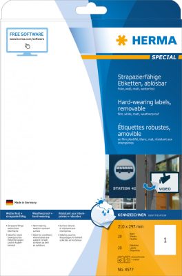 Herma No. 4577 fehér színű 210 x 297 mm méretű, lézernyomtatóval nyomtatható, öntapadós időjárásálló etikett címke, visszaszedhető ragasztóval A4-es íven - kiszerelés: 20 címke / 20 ív
