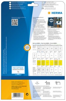 A Herma nyomtatható öntapadós címkéi kompatibilisek az általánosan forgalomban lévő irodai nyomtatókkal. A címkeív teljesen sík felületű, valamint négy papírmentes lapszéllel rendelkezik, mely ragasztómentes terület biztosítja, hogy nyomtatás közben ne kerülhessen ragasztómaradvány és egyéb szennyező anyag a nyomtató hengereire, görgőire, dobegységére. Ezáltal elkerülhetővé válik a címkék feltapadása a nyomtató belső alkatrészeire.