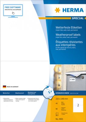 Herma No. 4601 fehér színű 210 x 148 mm méretű, tintasugaras nyomtatóval nyomtatható, öntapadós időjárásálló etikett címke, extra erős, tartós ragasztóval A4-es íven - kiszerelés: 80 címke / 40 ív