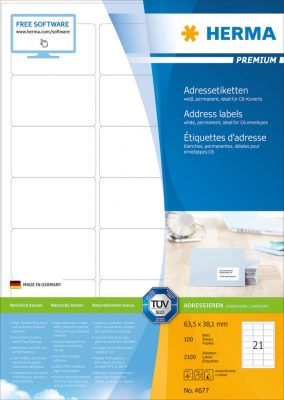 Herma No. 4677 fehér színű 63,5 x 38,1 mm méretű, univerzálisan nyomtatható, öntapadós etikett címke, permanens ragasztóval A4-es íven - kiszerelés: 2100 címke / 100 ív
