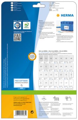 Herma prémium nyomtatható öntapadós címkék általános felhasználásra és címzésekre. Magas minőség, kiváló nyomtatási kép, erős és megbízható tapadás jellemzi. A Herma prémium nyomtatható öntapadós etikett címkéi megfelelnek a legszigorúbb minőségi és technológiai elvárásoknak is. A Herma prémium címke és a csomagolás 100%-ban újrahasznosítható alapanyagokból készül.