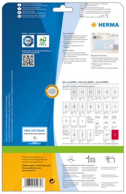 Herma prémium nyomtatható öntapadós címkék általános felhasználásra és címzésekre. Magas minőség, kiváló nyomtatási kép, erős és megbízható tapadás jellemzi. A Herma prémium nyomtatható öntapadós etikett címkéi megfelelnek a legszigorúbb minőségi és technológiai elvárásoknak is. A Herma prémium címke és a csomagolás 100%-ban újrahasznosítható alapanyagokból készül.