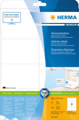 Herma No. 5077 fehér színű 99,1 x 67,7 mm méretű, univerzálisan nyomtatható, öntapadós etikett címke, permanens ragasztóval A4-es íven - kiszerelés: 200 címke / 25 ív