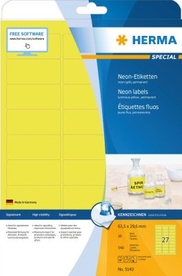 • Herma No. 5140 univerzális 63,5 x 29,6 mm méretű, neonsárga színű öntapadó etikett címke A4-es íven - 540 etikett címke / csomag - 20 ív / csomag (Herma 5140)