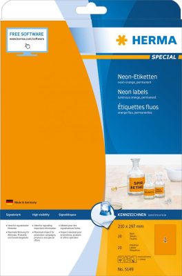 • Herma No. 5149 univerzális 210 x 297 mm méretű, neon narancssárga színű öntapadó etikett címke A4-es íven - 20 etikett címke / csomag - 20 ív / csomag (Herma 5149)