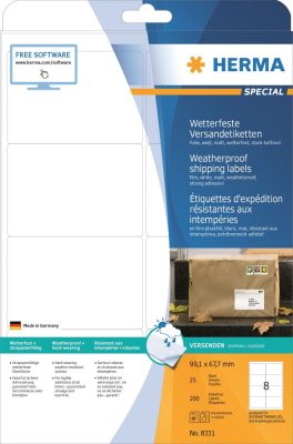 Herma No. 8331 fehér színű 99,1 x 67,7 mm méretű, lézernyomtatóval nyomtatható, öntapadós időjárásálló etikett címke, extra erős, tartós ragasztóval A4-es íven - kiszerelés: 200 címke / 25 ív