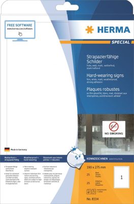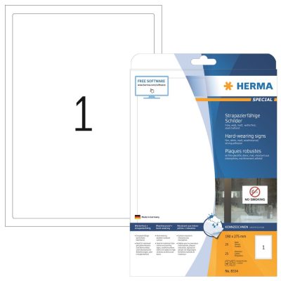 Herma No. 8334 fehér színű 190 x 275 mm méretű, lézernyomtatóval nyomtatható, öntapadós időjárásálló etikett címke, extra erős, tartós ragasztóval A4-es íven - kiszerelés: 25 címke / 25 ív