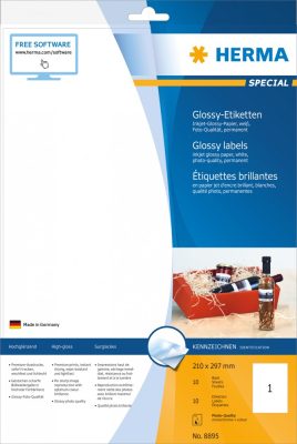 Herma No. 8895 fehér színű 210 x 297 mm méretű, tintasugaras nyomtatóval nyomtatható, fényes felületű öntapadós etikett címke, permanens ragasztóval A4-es íven - kiszerelés: 10 címke / 10 ív