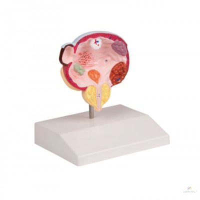 Ez az életnagyságú modell a frontális sík mentén metszett, és a férfi húgyhólyag öt különböző kórképét mutatja a jellegzetes helyen: hólyaghurut, hólyagkövek, jóindulatú prosztata hipertrófia (BPH), divertikulum, valamint hólyagdaganat három különböző stádiumban. Állványra szerelve.