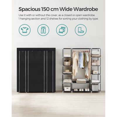 Hordozható gardrób, szövet ruhásszekrény, ruhatároló, 12 polcos, fekete |