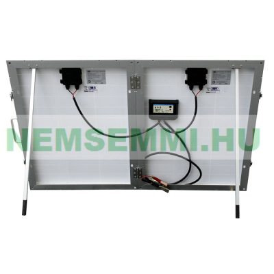 A két napelem össze van kötve és csatlakoztatva van egy töltésszabályozóhoz, amely a napelemek hátuljára van illesztve.