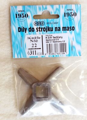 Cseh gyártású húsdaráló kés, nagyipari gyártás. Egyenes élű húsdaráló kés, a Porkert húsdarálók is ezzel, és KDS rostával szereltek. Használható a legtöbb 22-es húsdarálóba, az FHD-60 elektromos húsdarálóba is.