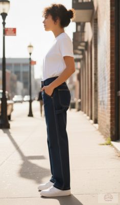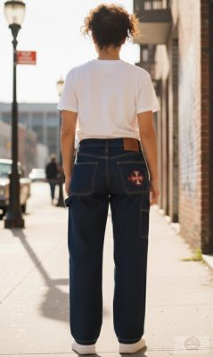 Stílus: Klasszikus ötzsebes fazon, hátul rávarrt zsebekkel.