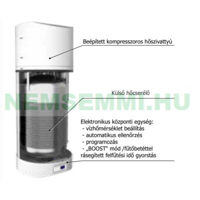A tartályban lévő vizet a hőszivattyú melegíti fel külső hőcserélőn keresztül.