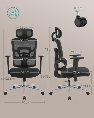 • Ergonomikus támaszték: a deréktámasz 6 cm-rel felfelé vagy lefelé állítható, hogy megfeleljen az ülési preferenciáknak. A háttámla 90°, 115° és 135° szögben állítható, és tökéletesen illeszkedik az Ön testéhez