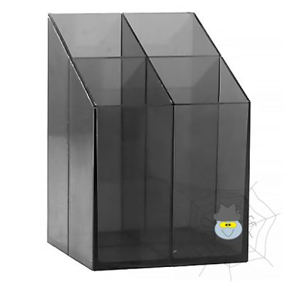 Asztali írószertartó szögletes kivitelben, 4 tárolórekesszel. Választható színek: szürke, transzparens kék, transzparens fekete. Feltöltés nélkül!
