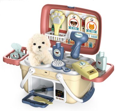 A bőröndben elhelyezett kutyakozmetika remek játék minden fiatal kutyabarát számára. A kisgyermek vigyázhat egy puha, szerető gazdira váró plüss kiskutyára. A készlet olyan kiegészítőket tartalmaz, amelyek segítségével a gyermek levághatja a kutyus karmait, megmoshatja a fogait, megfürdetheti, megszáríthatja a bundáját és megetetheti. Az egész egy kis praktikus hátizsákba van csomagolva, amiben a játék végeztével a termék részeit tárolhatjuk. Állítható pánttal, kényelmes fogantyúval és csattal rendelkezik, aminek köszönhetően a játékok nem esnek ki a bőröndből.