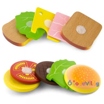 Játék szendvics és hamburger Fából készült színes szendvics és hamburger késsel. A szendvicsek szétszedhetőek, így többféle kombinációban is össze lehet állítani azokat. A különböző darabok tépőzárral illeszthetőek össze. Remek kiegészítője lehet a játékkonyhának. Különböző szerepjátékokhoz tökéletes kellék, melynes során fejlődik a gyermekek kézügyessége, a szociális készsége, bővül a szókincsük. Játék közben fejlődik a finommotoros készség, szem-kéz koordináció és a kreativitás.