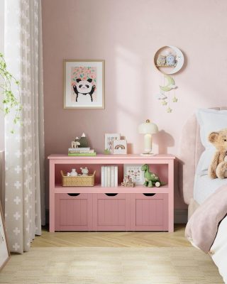 VASAGLE Játéktároló szekrény, gyerekpolc, szekrény és fiókos tároló 3 gurulós tárolódobozzal, nappaliba, hálószobába, játszószobába, 30 x 102 x 60 cm, rózsaszín