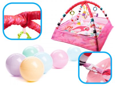 A szönyeg boltívrészére akasztható színes játékok felkeltik a baba figyelmét és motiválják a mozgásra, ezzel is erősítve a nyak a kar és a láb izmait.
