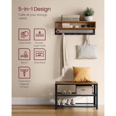 Kabáttartó cipőpad szett, előszoba fal paddal, előszobabútor, többfunkciós, kabátakasztók, kétszintes cipőtartó, ipari stílusú, bejárathoz, előszoba, rusztikus barna: