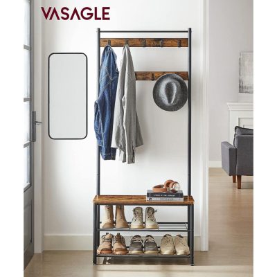 kabáttartó állvány, kabátfa, folyosói cipőtartó és pad polcokkal, csarnokfa kampókkal, matt acél keret, magasság 177 cm, ipari, rusztikus barna és fekete: