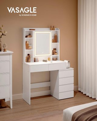 • TARTÓS ÉS KÖNNYEN TISZTÍTHATÓ:Masszív forgácslap panelekből készült, ez a sminkasztal robusztus és karcálló, így hosszú távon is használható. A sima felület könnyen tisztítható nedves ruhával.