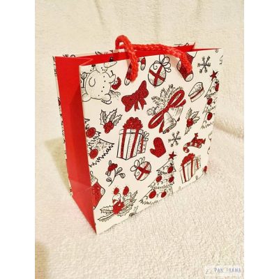 Karácsonyi mintázatú,csillámos díszítésű zsinóros dísztasak , vastag, jó minőségű.