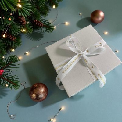 A doboz belsejét finom selyempapír borítja, és többféle feliratos szalaggal kérhető, hogy tökéletesen illjen az ünnepi hangulathoz.