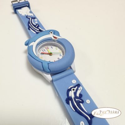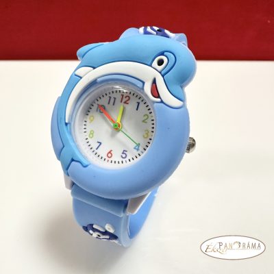 Gyerek karóra, 3D delfin mintás, világos kék szilikon szíjjal, fehér számlap színes számokkal, mutatókkal, acél hátlap