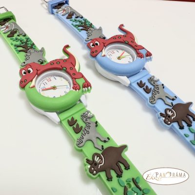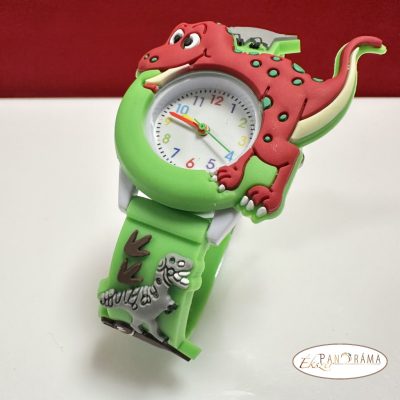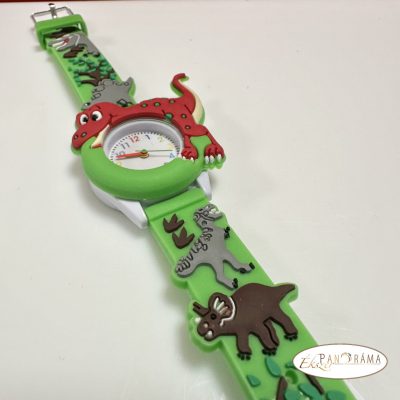 Gyerek karóra, 3D dínó mintás, zöld szilikon szíjjal, fehér számlap színes számokkal, mutatókkal, acél hátlap