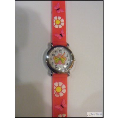 Gyerek karóra mintás szilikon szíjjal,virágokkal és pillangóval díszített szíjjal, mintás számlapja ezüst fém foglalatban, színes mutatókkal. Minden kislány örömmel veszi ezt az ajándékot!