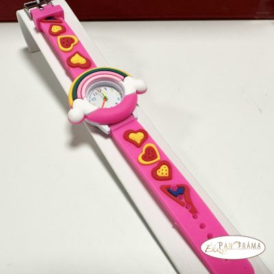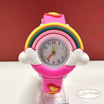 Gyerek karóra, 3D szivárványos, felhő mintás, szilikon szíjjal, fehér számlap színes számokkal, mutatókkal, acél hátlap