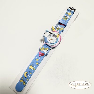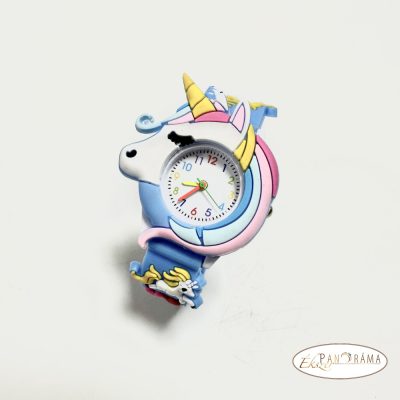 Gyerek karóra, 3D unikornis mintás, rózsaszín szilikon szíjjal, fehér számlap színes számokkal, mutatókkal, acél hátlap
