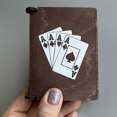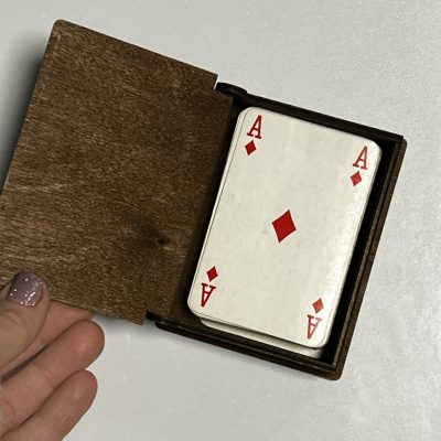 Prémium minőségű fa kártyapakli doboz, amely elegánsan és biztonságosan védi a lapokat. Tartós, természetes és ajándéknak is tökéletes, igény szerint személyre szabható. A képen látható doboz paliszander pácolású és a fedelet kézzel festett lapok díszítik.