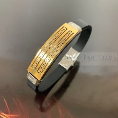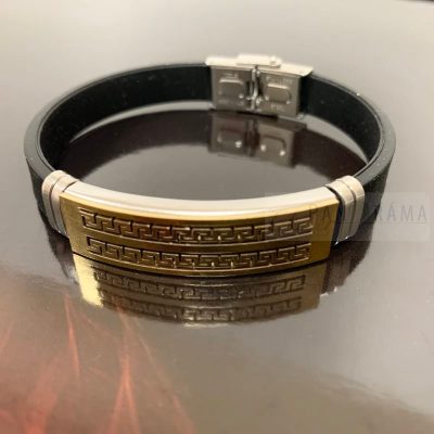 Férfi karkötő Kaucsuk-acél kombinációval. Felső lapja aray színnel díszített.