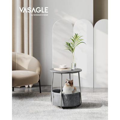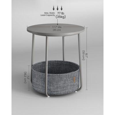 Kis, kerek oldalsó asztal, modern éjjeliszekrény szövetkosárral