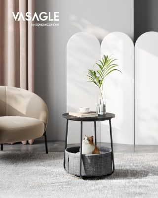 Kerek dohányzóasztal, kis asztal, Kicsi Kávézóasztal, Nappali Asztal, Szövet Kosár Tárolóval, Tárolóhely Nappaliba vagy Hálószobába, Modern Éjjeliszekrény, Ébenfekete-Pala Szürke