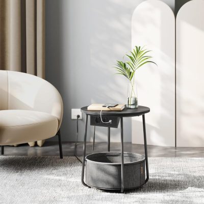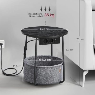 Kerek asztalka töltőállomással, kis asztal aljzattal, dohányzóasztal, USB portok, szövetkosár, nappali, hálószoba, éjjeliszekrény, modern, ébenfekete/palaszürke: