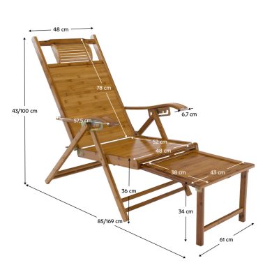 Anyag: masszív bambuszfa Szín: természetes Méretek (SzxMéxMa): 61x85-169x43-100 cm Ülés magassága: 36 cm Ülés mélysége: 52 cm Ülés szélessége: 48 cm Háttámla magassága: 78 cm A háttámla szélessége: 48 cm Teherbírás: 100 kg Súly: 13 kg Kerti Összecsukható Állítható 5 pozícióban dönthető Fejtámla Karfákkal Fotel Nyugágy Kihúzható lábtartóval Lábtartó méretei (SzxMé): 43x38 cm Praktikus Modern dizájn Egészben szállítva
